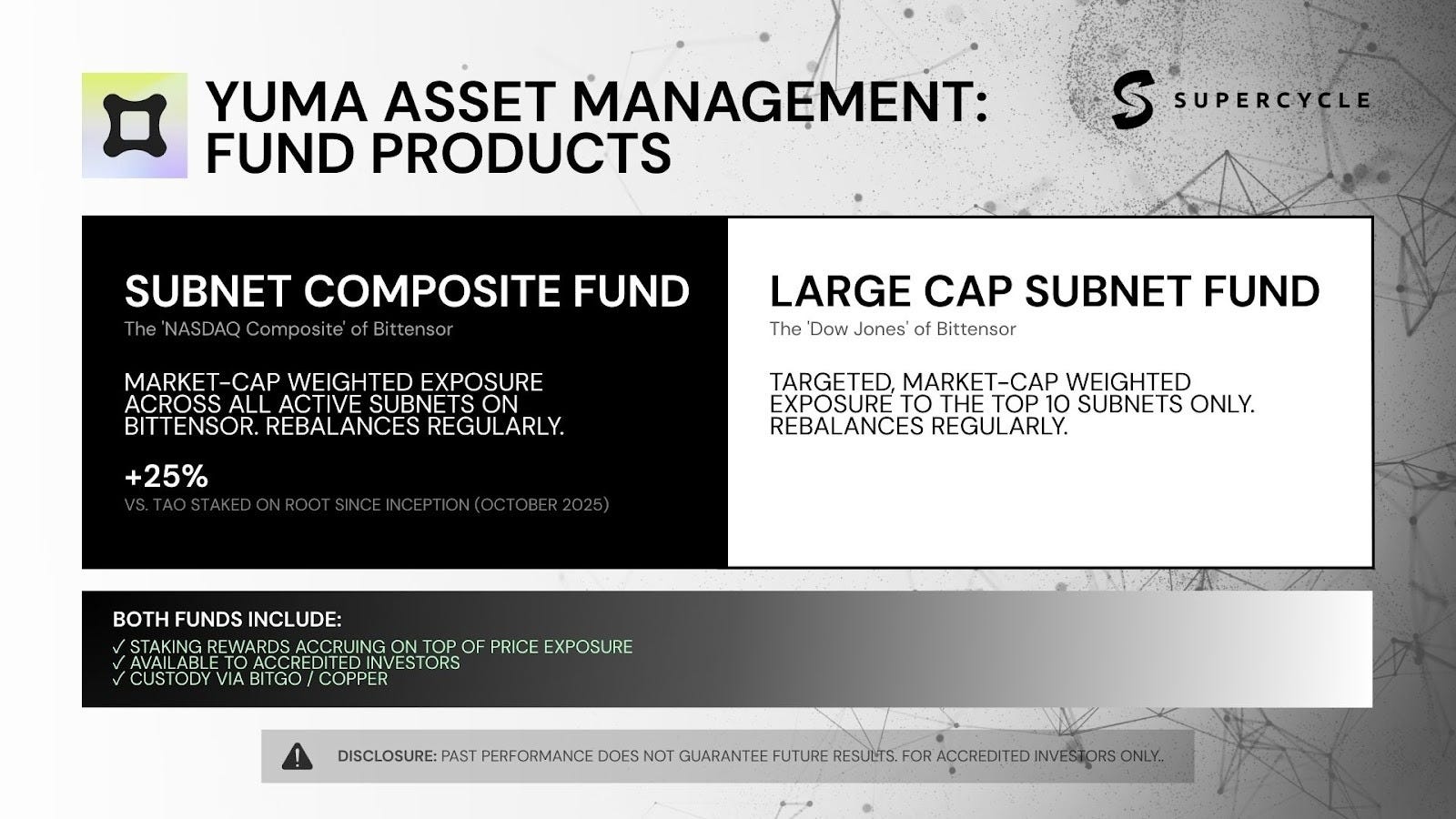 After the Dynamic TAO (dTAO) protocol update launched, the subnet economy exploded from 64 to 128 subnets in weeks. But the infrastructure to invest in it did not keep pace; major custodians like BitGo and Copper did not yet support subnet tokens. Meanwhile, exchanges like Kraken and Coinbase had TAO listed, but offered zero subnet-level exposure.