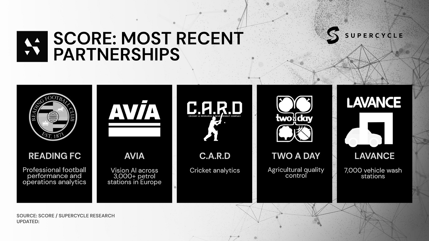 The claim is it’s 10-100x cheaper (🚩: self-reported and unaudited, but directionally credible given the decentralized compute model). SCORE reports $3M annualized revenue from 7 enterprise clients, with an average contract value of $428K per client.
