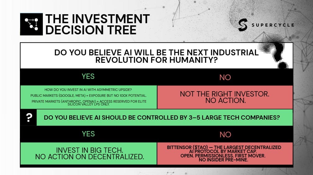 This is the whitespace that Bittensor ($TAO) was built for. It’s the largest decentralized AI protocol by market cap. It’s open, permissionless, and free from the insider pre-mines that define its competitors.