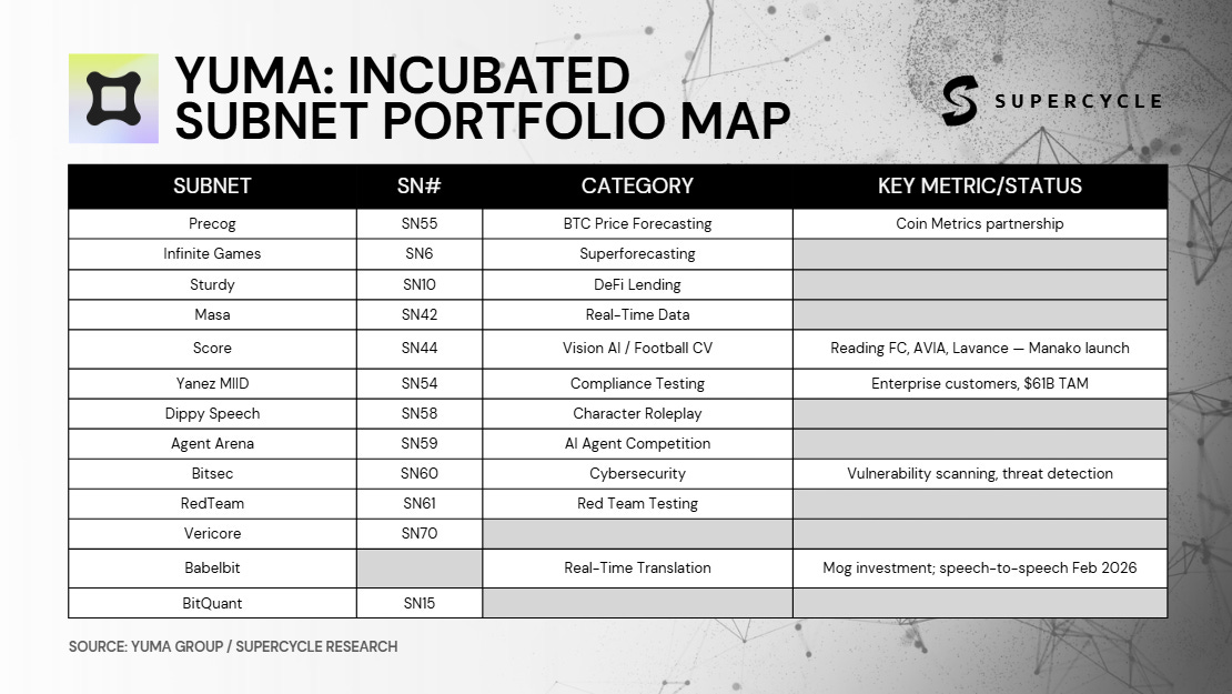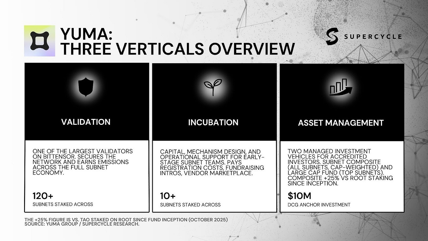 Yuma, DCG’s dedicated operating arm inside Bittensor, is the institutional bet that the ecosystem is real. It’s a validator, subnet incubator, and institutional on-ramp rolled into one.